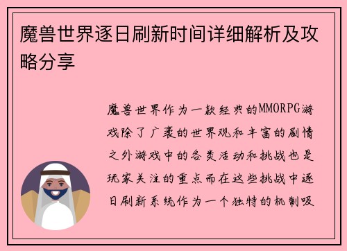 魔兽世界逐日刷新时间详细解析及攻略分享