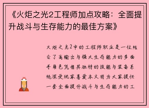 《火炬之光2工程师加点攻略:全面提升战斗与生存能力的最佳方案》