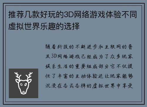 推荐几款好玩的3D网络游戏体验不同虚拟世界乐趣的选择